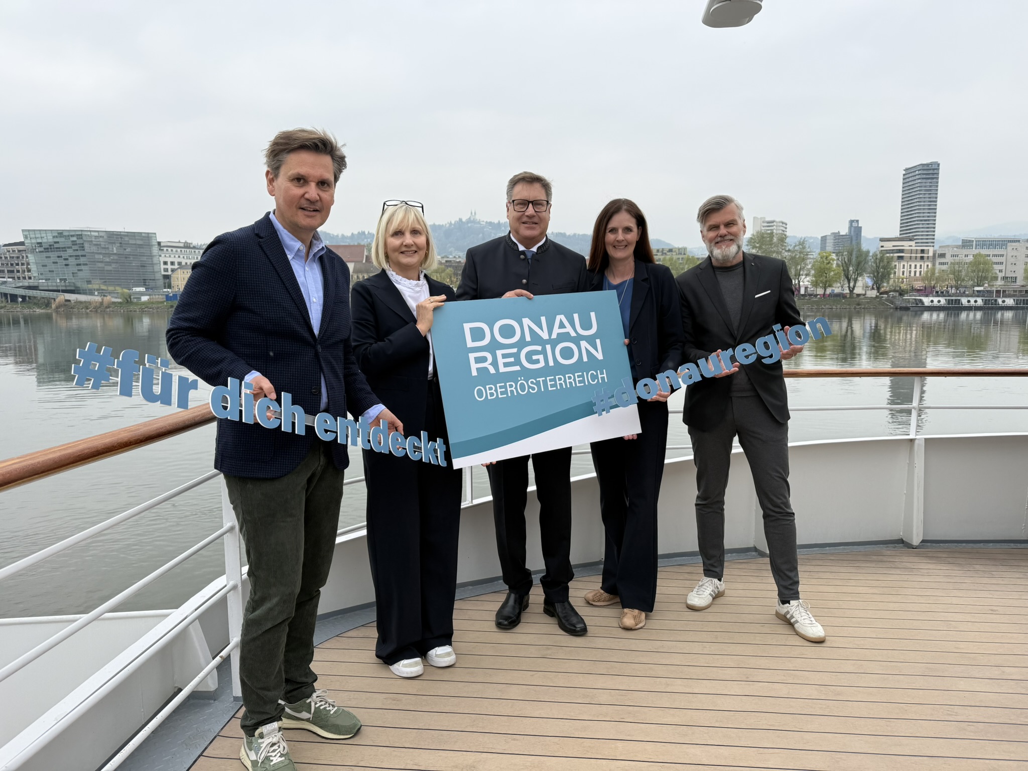 Linz, 14.04.2026: Im Rahmen eines Pressegesprächs zum Thema „Für dich entdeckt: Donauregion Oberösterreich. Neue Perspektiven auf Tourismus, der nachklingt“ wurde der neue Markenauftritt der Donauregion Oberösterreich am Barefoot Boat in Linz präsentiert.